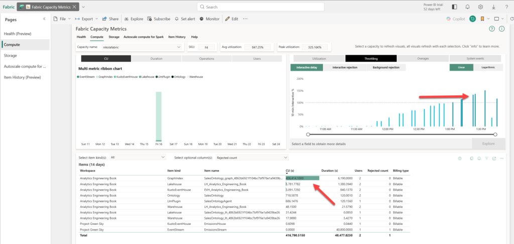 As you can see in the illustration below, a screenshot from the Capacity Metrics App, the Graph item (Sales Ontology) exhausted all resources and caused my capacity to be throttled.