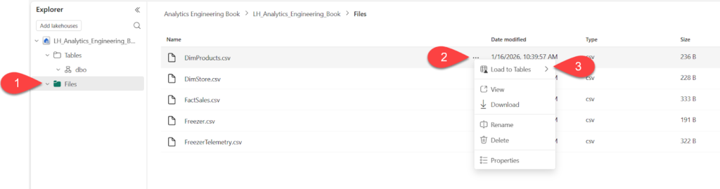 Next, let’s make this data available in the lakehouse. Let’s upload the files to the Files section of the lakehouse, and then transform them to Delta tables in the Tables section, as shown below. We will do that for all the files except the FreezerTelemetry file.