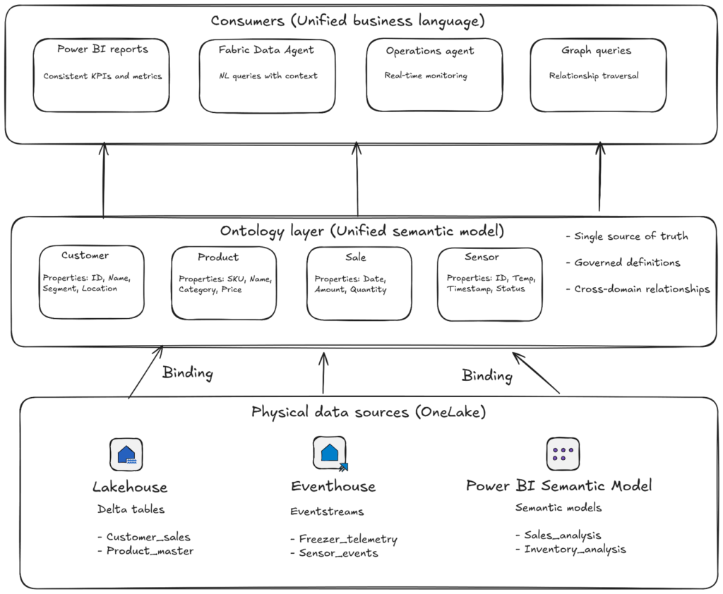 The power of Fabric IQ happens through a concept called binding. When you create an ontology, you’re not just drawing boxes and arrows in a diagram – you’re rather connecting those abstract business concepts to real data living across your OneLake ecosystem. A single entity type like Customer can be bound to columns from your lakehouse tables, eventhouse streams, and even existing Power BI semantic models. The ontology handles the heavy lifting: it maps data types, defines identity keys, describes how columns map to properties, and establishes how those keys create relationships across multiple sources. This means when your marketing automation system, your CRM, and your billing platform all have slightly different customer records, the ontology can reconcile them into a single, coherent business entity. Updates in upstream sources require manual refresh, but once refreshed, every downstream consumer, whether it’s a Power BI report, a Fabric Data Agent, or an Operations Agent, sees the same unified view.