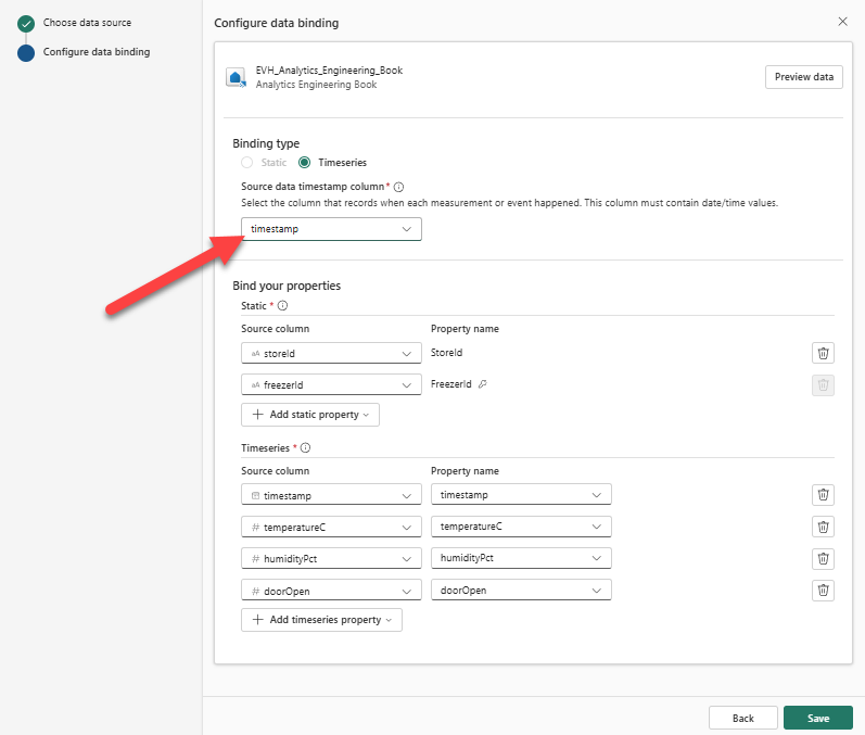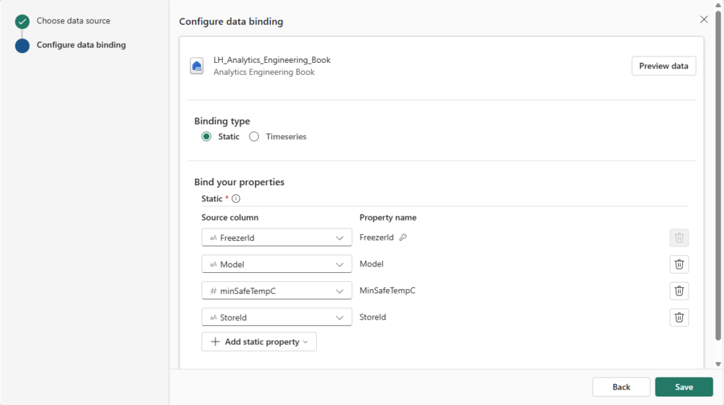 In the following steps, we will enrich our ontology with time-related data. From the Entity type configuration pane, under the Bindings tab, choose the Add data to entity type. This time, we will pick our eventhouse as a source, and the FreezerTelemetry table as a source table. The following figure shows the binding settings for the Freezer entity:
