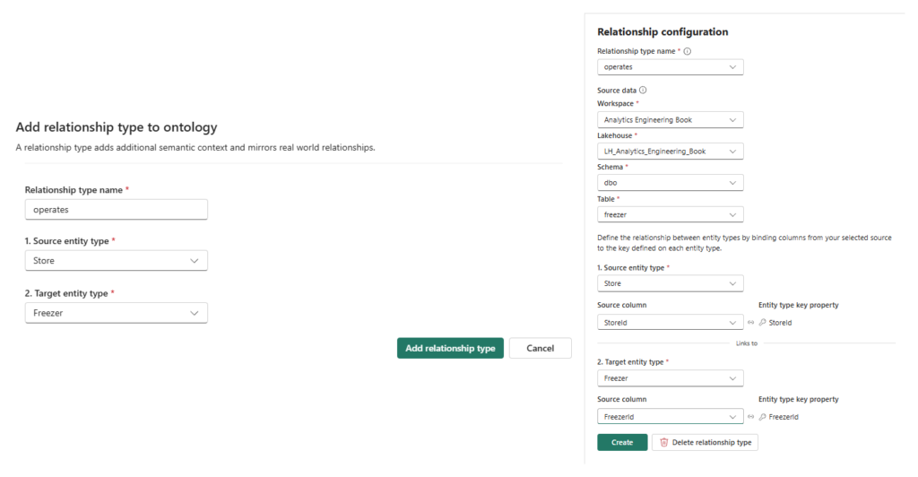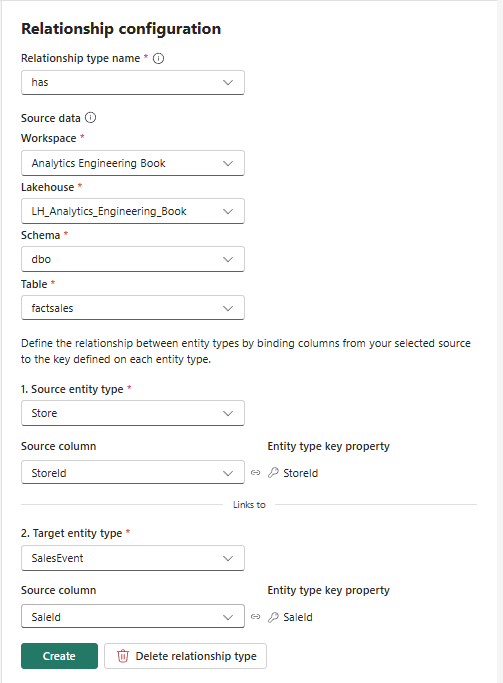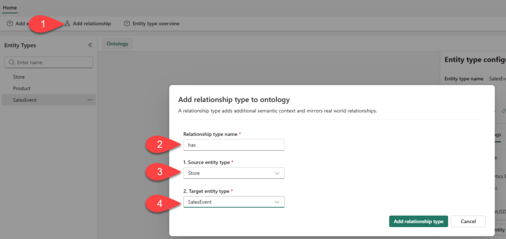 Now that we’ve created all the entities, let’s establish relationships to represent contextual connections in the data. The following illustration displays the process of creating a relationship between the Store and the SalesEvent entities: