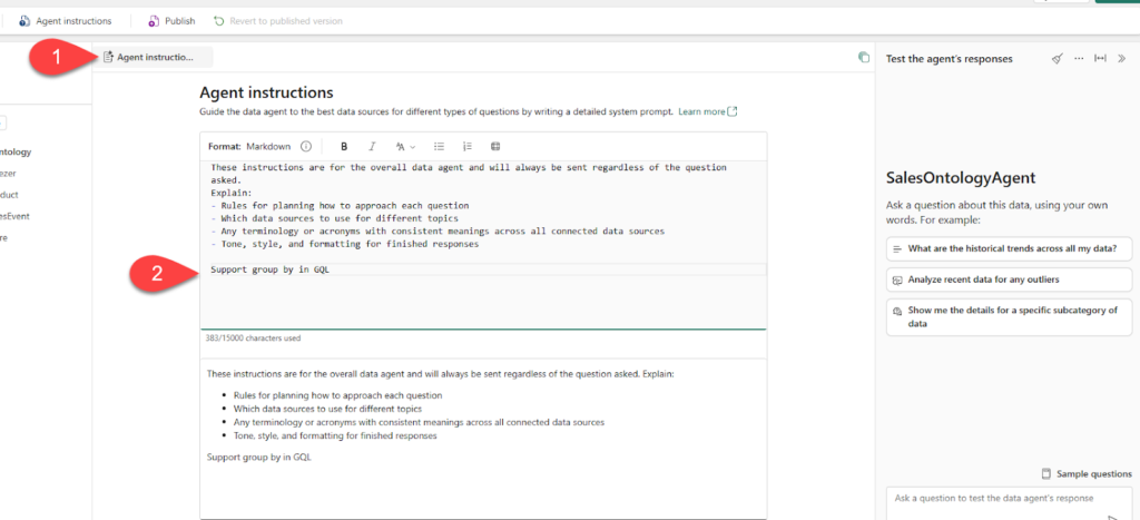 Once the agent is created, we will add the ontology as a data source. Next, let’s feed our agent with the additional instructions. Click ok the Agent instructions, and then add the “Support group by in GQL” at the bottom of the instruction window, as displayed below: