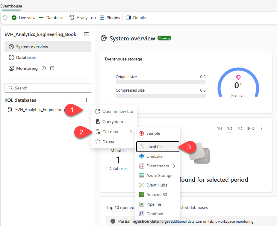 Next, we will create a new Eventhouse in the same Fabric workspace. Once the eventhouse is created, click on the three dots next to the default KQL database, choose Get data, and then Local file, as illustrated below: