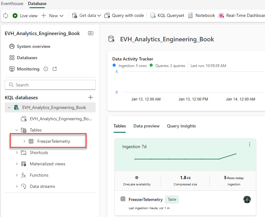 Provide the name for the table, and load the data from the FreezerTelemetry.csv file you previously downloaded. After confirming all the default settings, you should be able to see the FreezerTelemetry table in the KQL database, as shown in the following illustration: