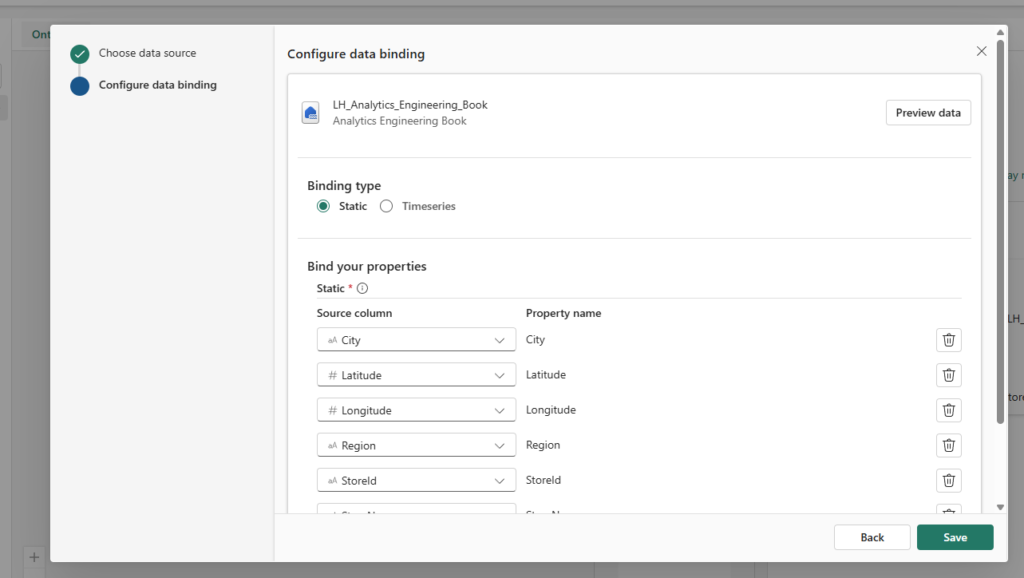 Connect to the lakehouse you previously created, and from the dropdown list, pick the dimstore table. The figure below displays the default, static binding type. The source column side lists column names in the source data, while the property name side lists their corresponding property names on the Store entity type within the ontology. Don’t change the default property names, which match the source column names.