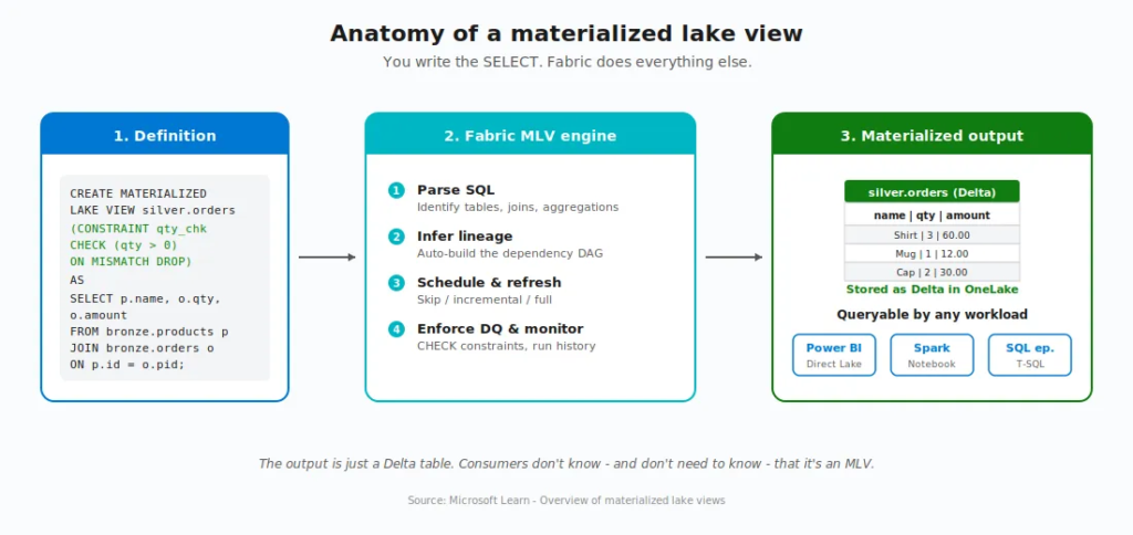 - Query – Any application or tool reads the materialized result. They don’t know – and don’t need to know – that it’s an MLV.