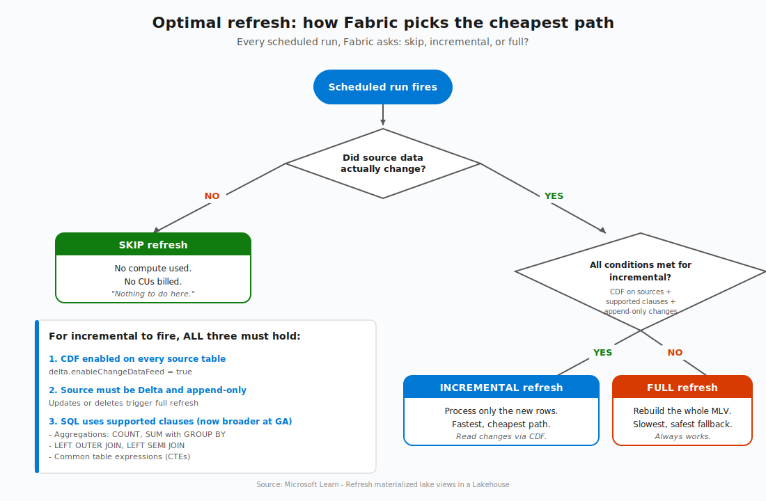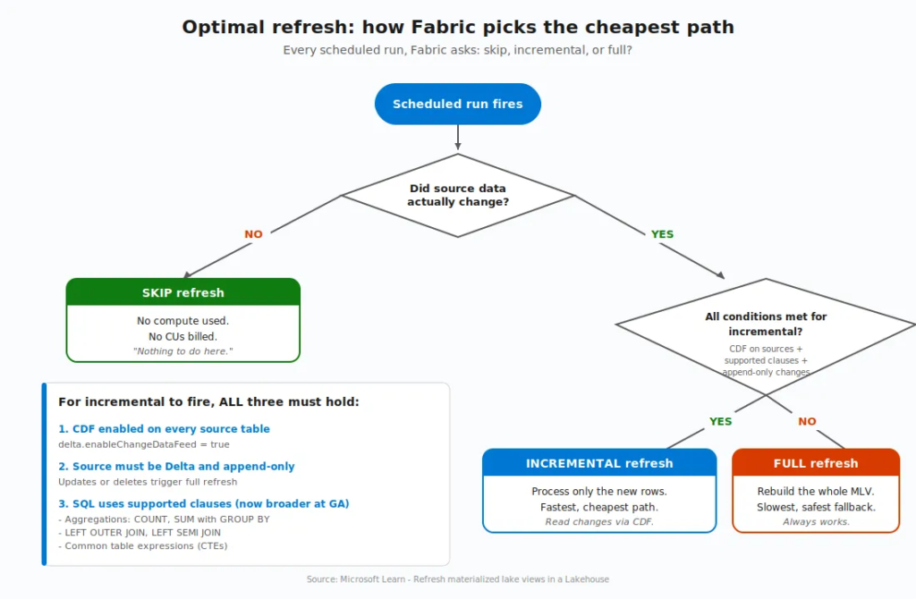 When source data changes, Fabric’s optimal refresh engine looks at every MLV in the lineage and asks a series of questions: Did anything actually change? Can I process just the changes? Or do I need to rebuild from scratch?
