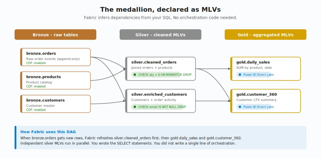 When one MLV references another (or a table), Fabric infers the relationship automatically. No manual configuration, no external orchestration tool. The dependencies are discovered from your SQL.