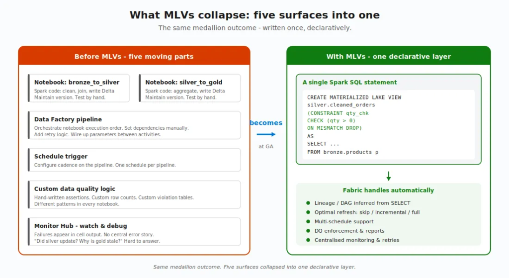 With MLVs, all of that collapses into declarative SQL. You describe what you want. Fabric figures out the rest.