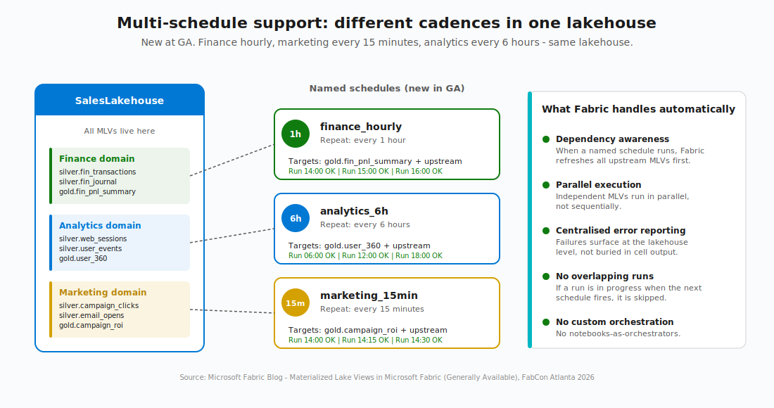 Now you can define named schedules within a single lakehouse, each targeting a specific subset of views. Finance pipeline hourly. Analytics every six hours. Marketing every 15 minutes. All in the same lakehouse, no custom code.