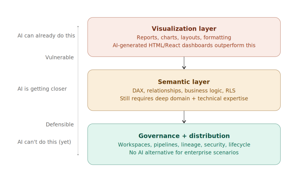 If your value is in the semantic layer: data modeling, DAX, business logic, you’re in a much stronger position. This is the hard part. The part that requires a deep understanding of both the data and the business. The part where a single wrong relationship or an incorrect measure can produce misleading numbers. AI can’t reliably do this yet. When it can, that’s when the real disruption happens.